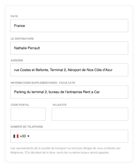 Les aéroports disposent d’un territoire gigantesque, ce qui complique la tâche aux livreurs. Veuillez indiquer l’adresse complète du point d’enlèvement ou de livraison pour pouvoir expédier des bagages depuis l’aéroport. Évitez de marquer simplement « aéroport Paris CDG » dans le champ d’adresse.
