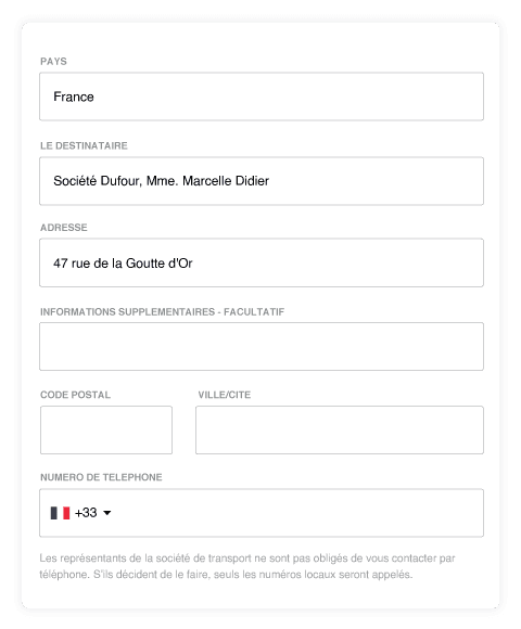 Numéro de téléphone : Pour assurer la livraison de votre colis personnel sur votre lieu de travail, il est fortement recommandé de communiquer un numéro de téléphone local. Les livreurs communiquant principalement avec la langue locale, il est important de donner un numéro de téléphone correspondant. Si vous ne parlez pas la langue locale, nous vous conseillons de donner le numéro de quelqu’un qui la parle.